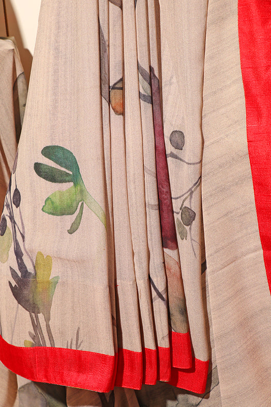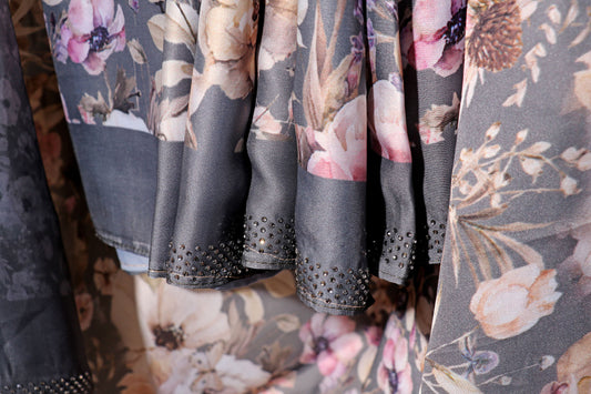 Ash Grey Floral Satin Georgette Saree with Silver Crystal Border 106