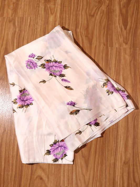 Pale Beige Satin Silk Saree with Purple Chrysanthemums & Orange Khadi Contrast Blouse 092