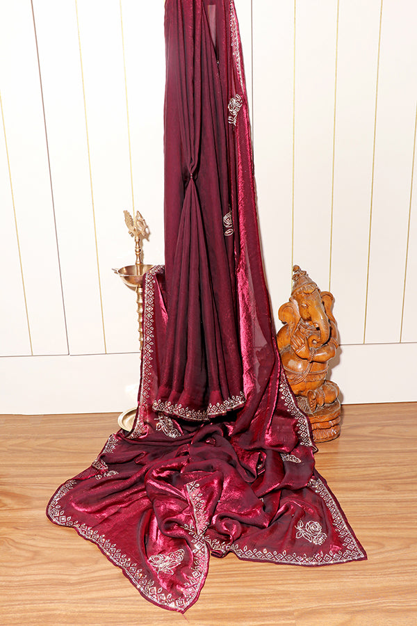 This rich wine-colored saree in luxurious silk features delicate silver rose motifs scattered throughout and intricately woven zari embroidery along the borders. The deep, lustrous hue paired with soft shimmer creates a regal drape, while the minimal floral embellishments add a graceful charm. Ideal for weddings, evening celebrations, or festive gatherings, this saree blends traditional craftsmanship with timeless elegance.