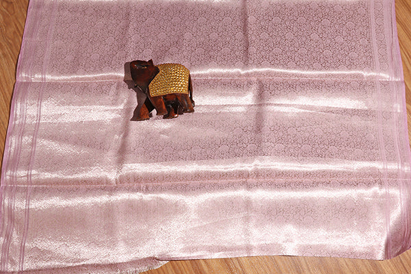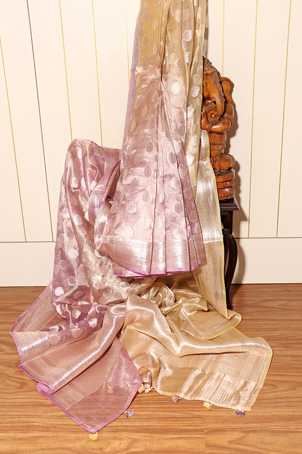 Soft as a whisper and radiant as dawn, this pure Banarasi tissue organza saree blends delicate rose gold and beige hues with shimmering silver polka motifs. The sheer organza texture adds an ethereal lightness, while the violet selvedge and multicolor tassels lend a playful, modern touch. Perfect for day weddings, mehendi ceremonies, or elegant brunch affairs, this saree is a dreamy fusion of tradition and contemporary sophistication.