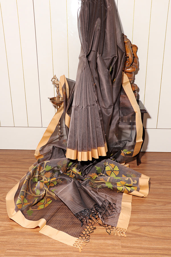 A true heirloom from the looms of Bengal, this pure Jamdani saree from Calcutta is a refined blend of artistry and tradition. Woven in a deep charcoal base with subtle pinstripes, the saree is graced with intricate handwoven Jamdani floral motifs in mustard, ochre, and green—symbolizing nature’s quiet resilience. The soft beige border adds balance, while the knotted fringe hem completes its artisanal look. Light yet luxurious, this saree is ideal for cultural events, handloom exhibitions, or as a timeless collectible for the discerning saree lover.