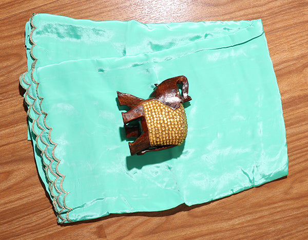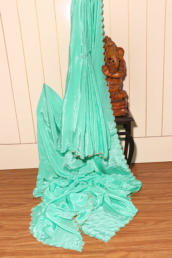 Fresh as spring dew, this green satin saree is all about understated elegance and fluid drape. The glossy satin fabric glides effortlessly, while the delicate scalloped edges with golden embroidery add a charming finish. Lightweight and minimal, it’s a versatile pick for brunches, haldi ceremonies, evening dinners, or destination weddings where simplicity shines with sophistication.