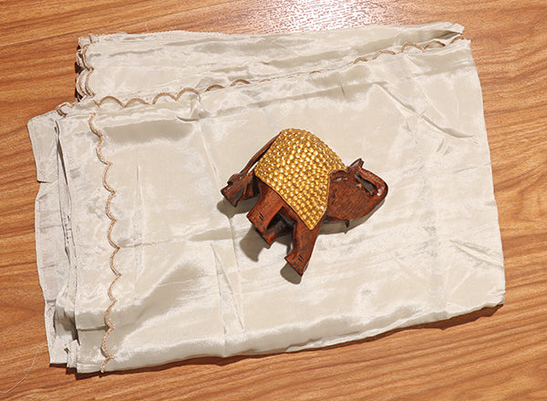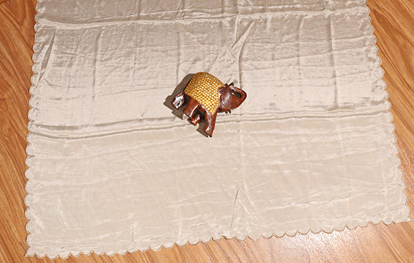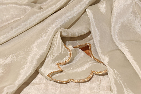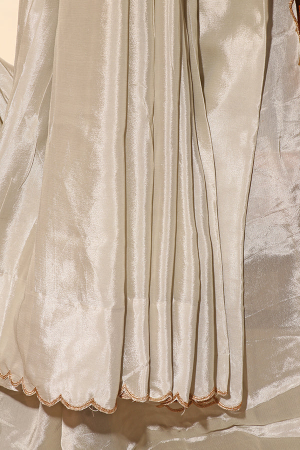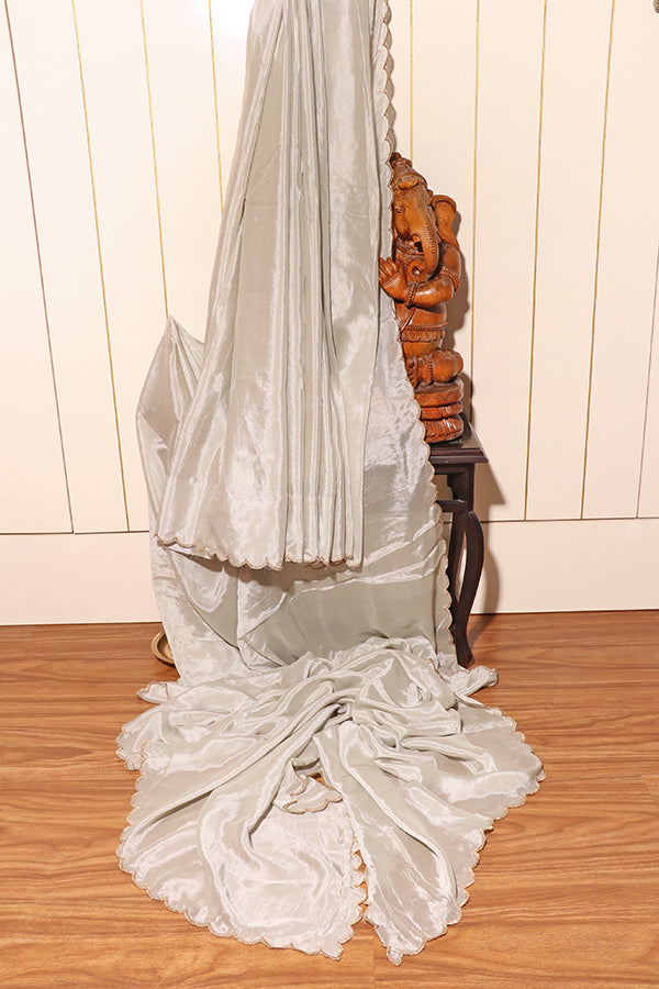 This light silver satin saree is the definition of understated luxury. The smooth, gleaming fabric flows effortlessly, catching light at every fold. Accented with subtle scalloped edges and delicate embroidery, it radiates quiet sophistication. Perfect for cocktail evenings, receptions, or even a minimalist bridal look, this saree blends tradition with modern grace.