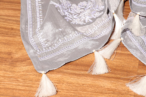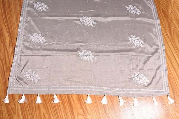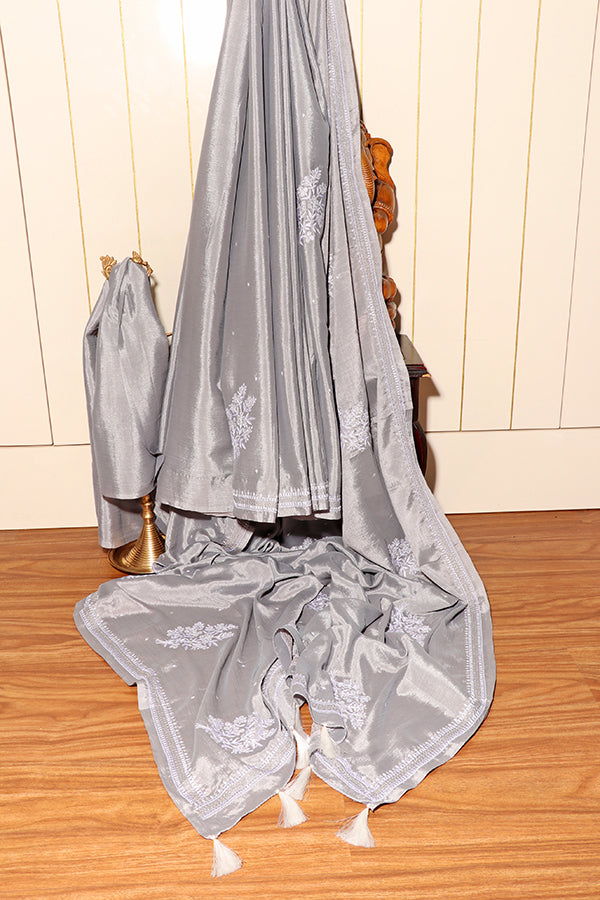 Silver Serenity is a timeless and graceful saree that exudes quiet sophistication. Made from a smooth, light-reflective satin blend, it features delicate floral embroidery in matching silver thread and is finished with subtle tassel details for added charm. This saree brings effortless elegance to any occasion, whether day or evening.