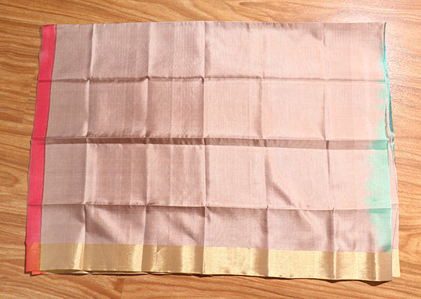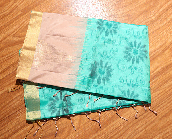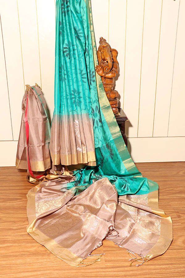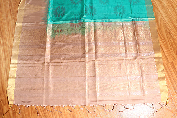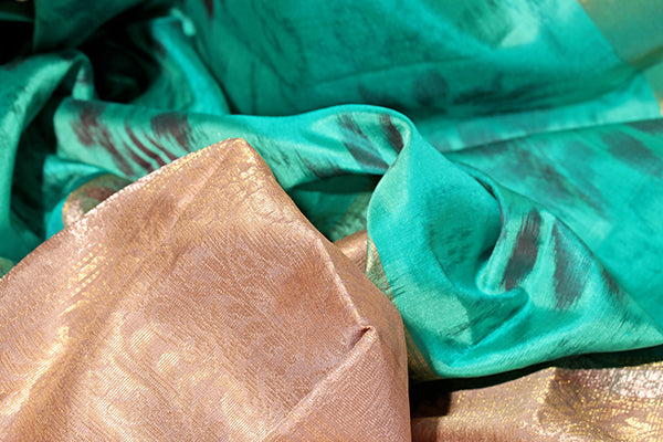 Blue Radiance is a luxurious pure silk and ikkat silk saree that radiates traditional richness with a contemporary edge. The vibrant emerald green body beautifully contrasts the muted beige-gold pallu, enhanced with zari weaving and a soft golden border. Ideal for weddings and festive occasions, this saree is a celebration of Indian textile heritage.