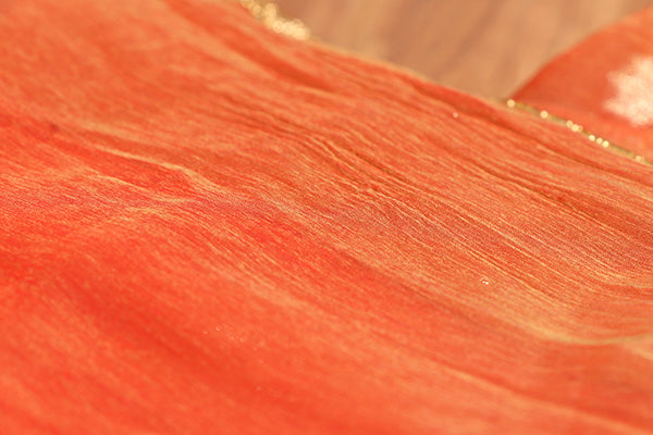 Set the room aglow with Amber Blaze, a radiant shimmer chiffon saree in a bold burnt orange hue. The luminous gold undertone woven into the fabric brings warmth and vibrancy to every drape. Accented with a delicate gold lace border, this saree is equal parts fiery and elegant—perfect for festive evenings or sunlit celebrations.