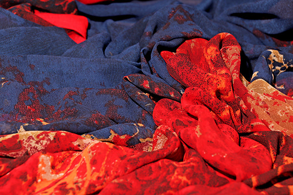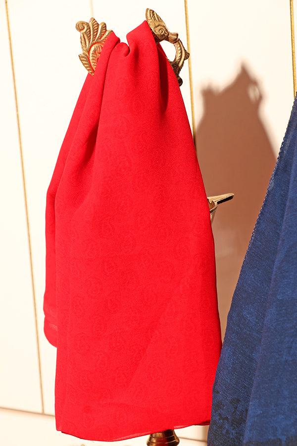 Bold meets beauty in Midnight Ember, a stunning georgette saree that weaves together deep navy and fiery red through intricate digital prints. The lightweight fabric flows effortlessly while the vibrant pallu, bursting with digital flame-inspired motifs, adds dramatic flair. Finished with a crisp red border, this saree commands attention with grace.
