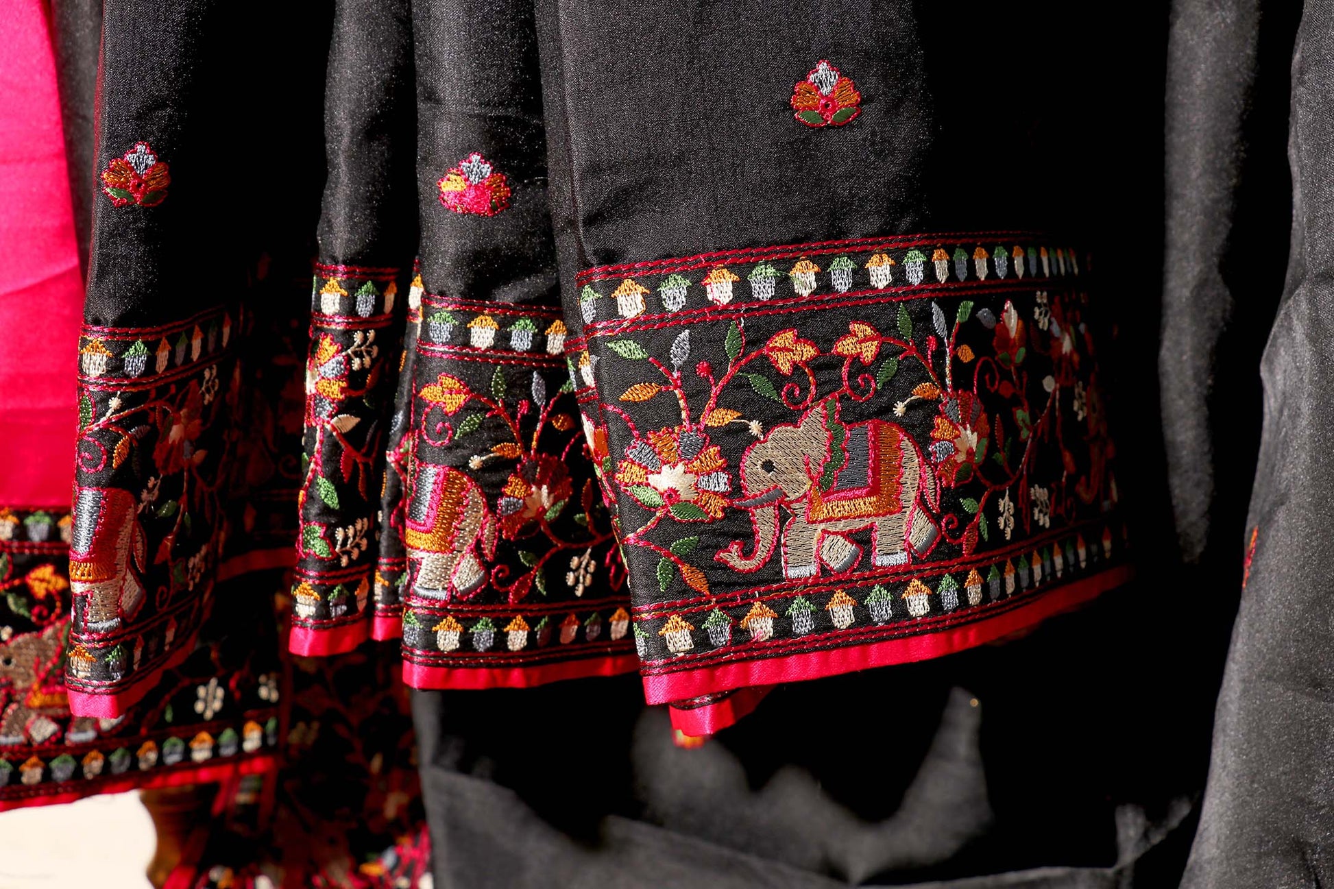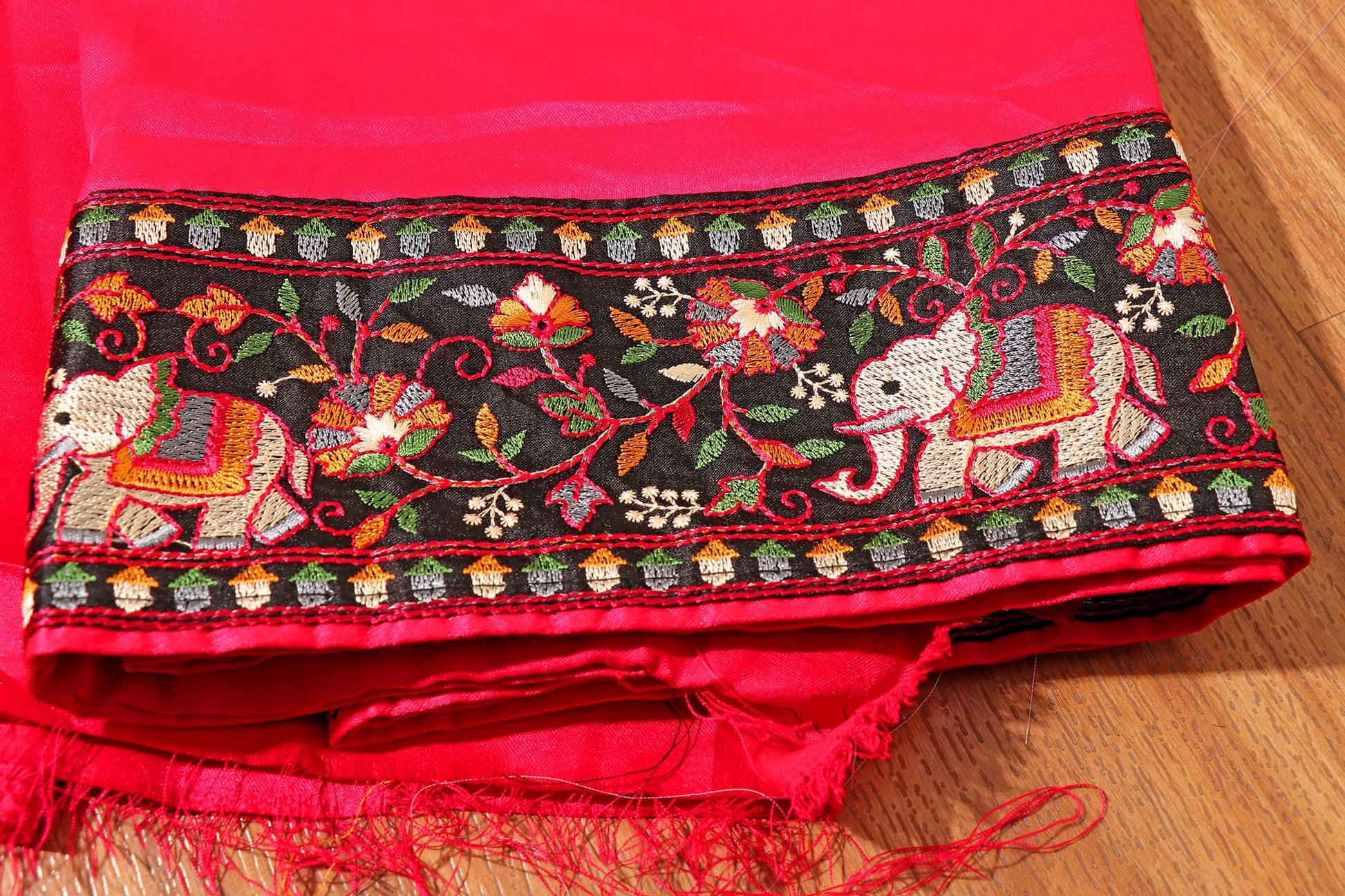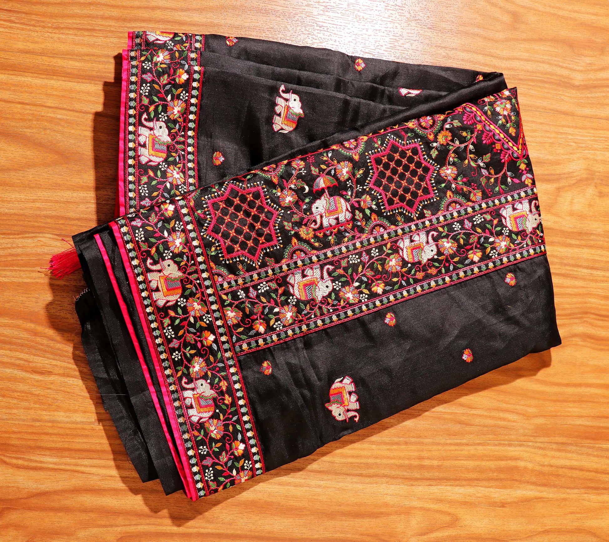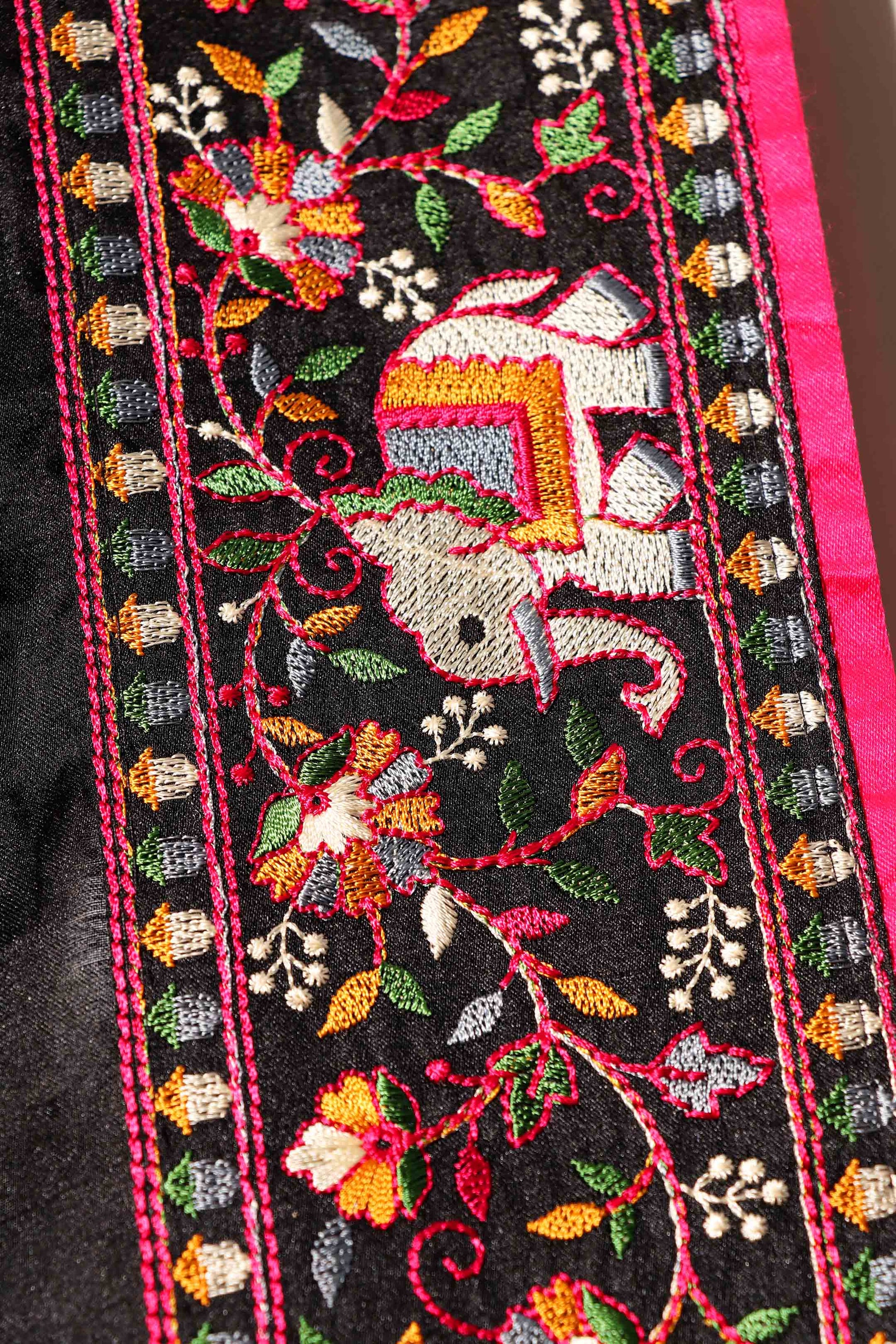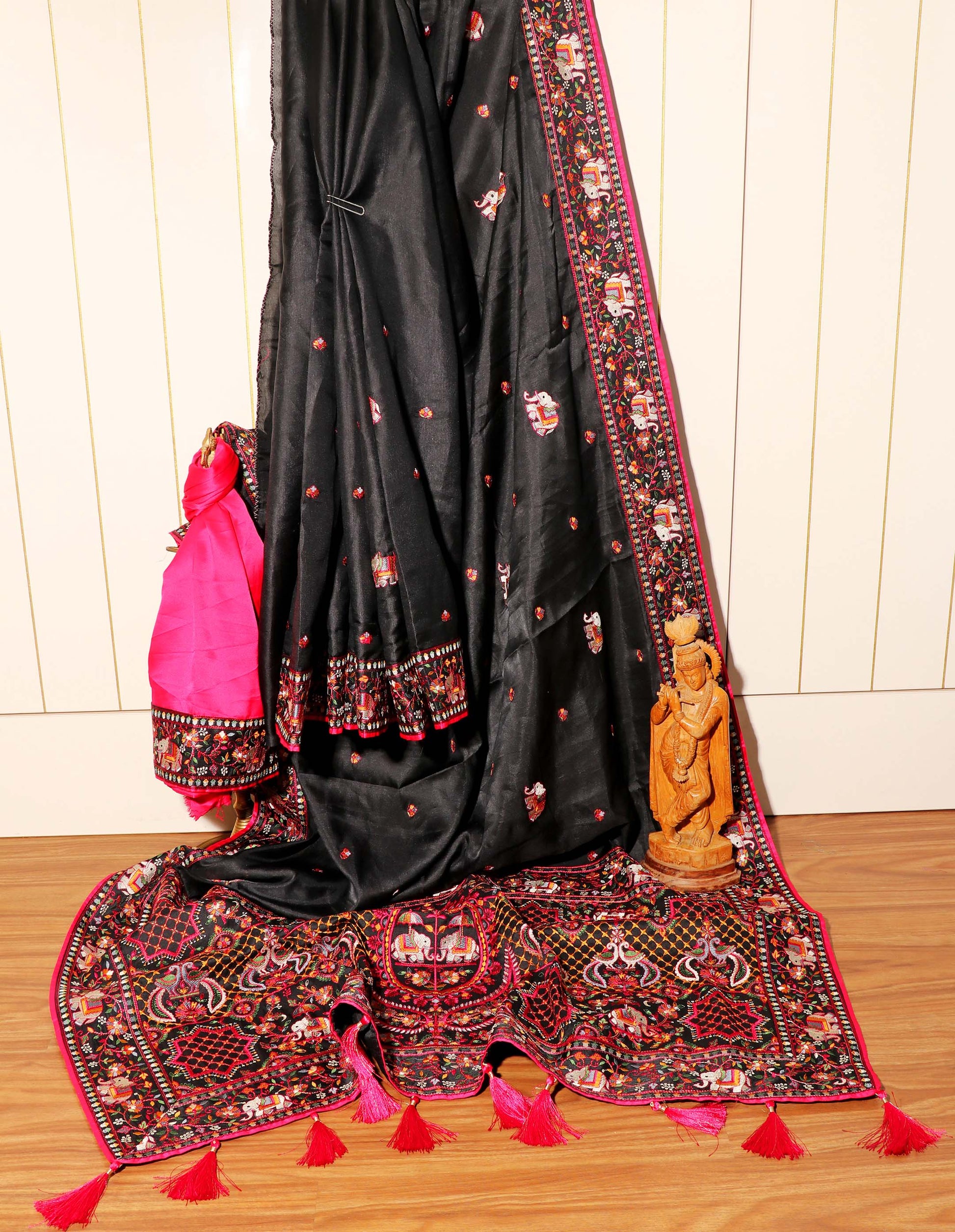 This elegant silk-blend saree features a striking combination of black and rani pink, highlighted with intricate Kutchi haathi embroidery woven beautifully across the body. The pallu is richly detailed with heavy embroidery and finished with playful tassels, while the saree is framed with a luxurious, heavy border that adds depth and sophistication to the overall look. Perfect for festive occasions and celebrations, this piece blends traditional craftsmanship with modern appeal.